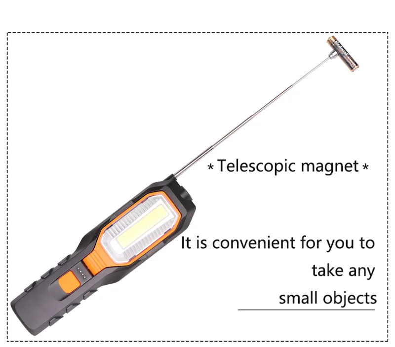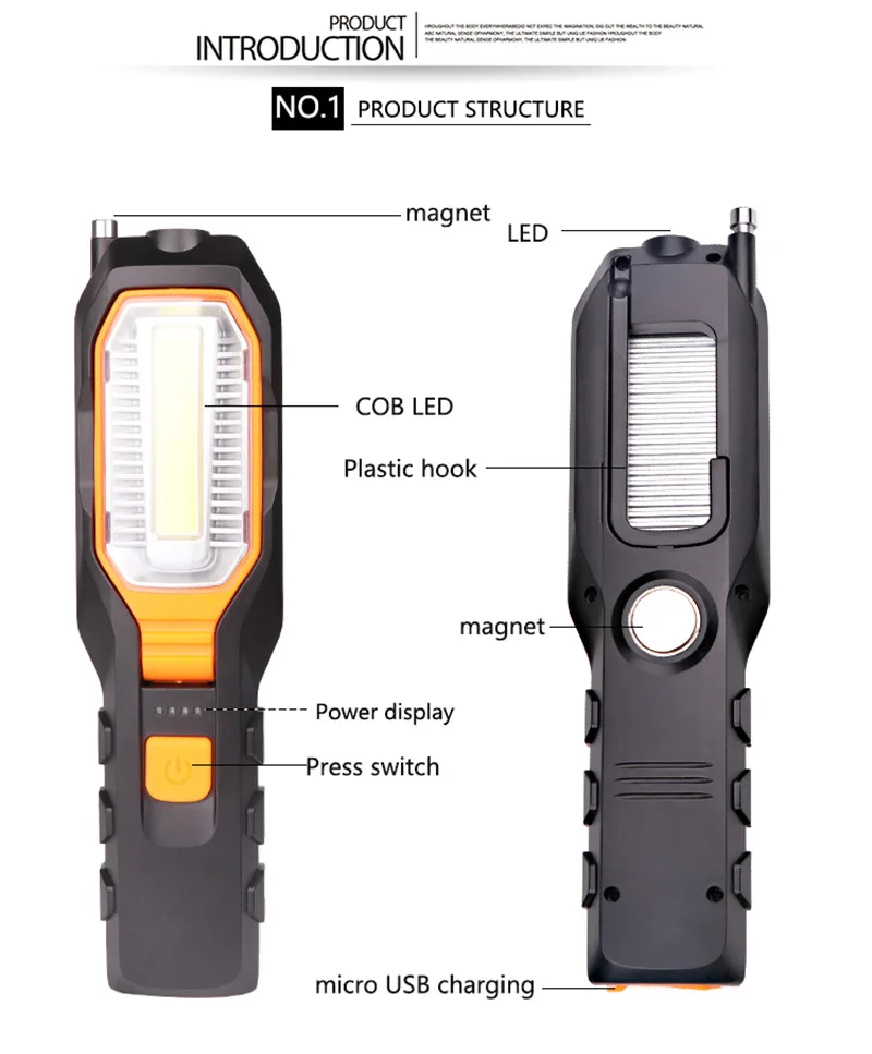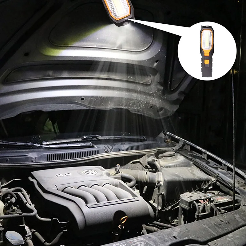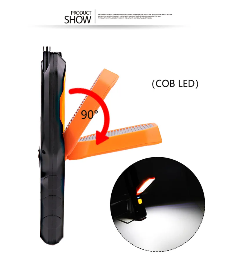 4 Modes & Rechargeable--Exchanging batteries is an unnecessary and expensive pain.Built-in lithium battery last longer than any flash lights with conventional batteries.4 modes of option: Led high brightness / COB white high brightness / COB white low brightness / COB red light strobe.90°Rotary,Magnet plate & Hook--Flexible 90 degree rotate beam provide multi-angle illumination.With the magnet plate and hook,you can attract the work light to any kind of iron products or hang it elsewhere,which make your hand free to do other things in the night. With power displayer to help you know the power amount and charge soon.Great for car repair, home lighting, camping, hiking, power outages and emergency.