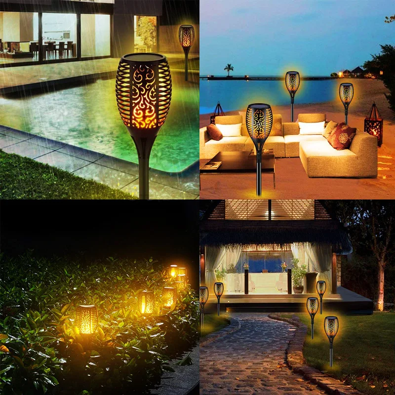 SOLAR POWERED AND AUTO ON/OFF FROM DUSK TO DAWN---This dancing flame torch light collects solar energy all day under direct sunlight, then turns on automatically at dusk and turn it off when it's dawn. The light runs on solar power, so you can place it anywhere under direct sunlight.