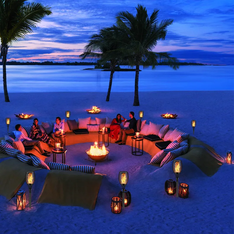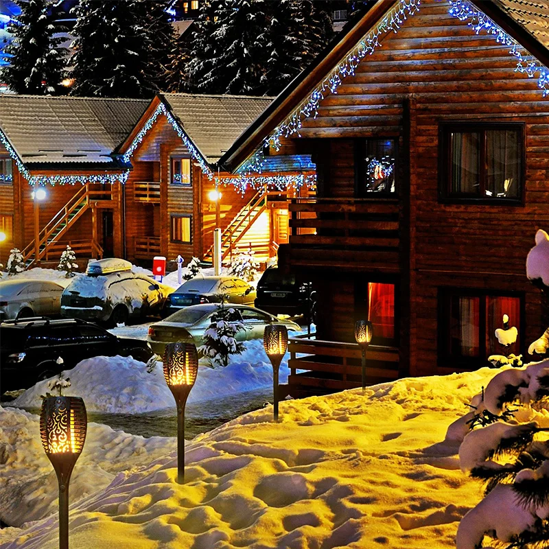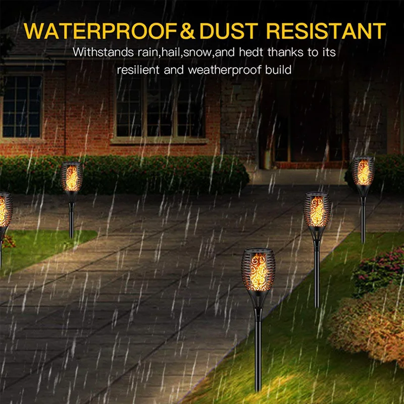 IP65 Waterproof, Fearless Into the Storm--- IP65 Waterproof and dustproof design make it withstands rain, hail, snow, and heat. No fear to place this solar flame lights in the yard for a whole year, and the firm spike allows the torch insert to the ground stably.