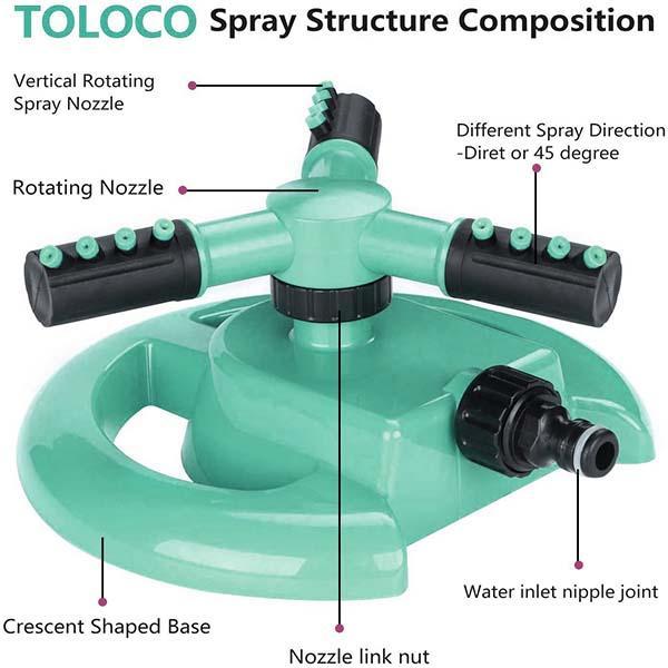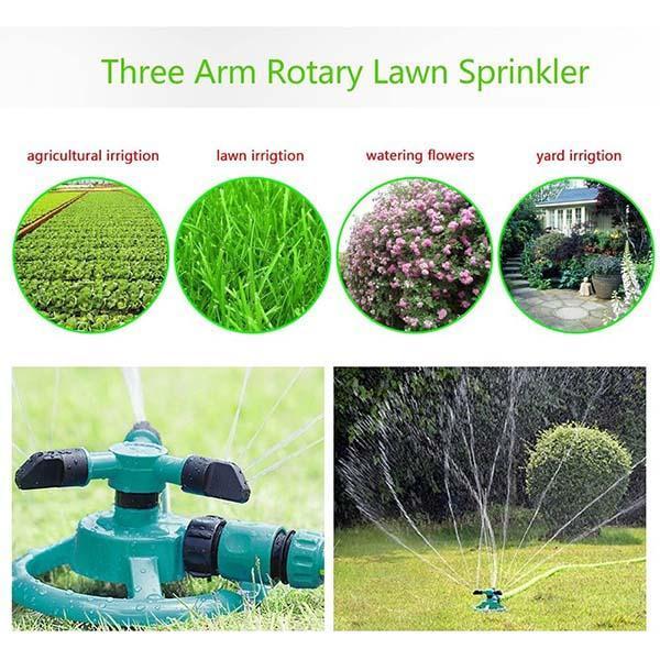 - Lawn irrigation, garden watering. Three-arm and 360-degree rotation. Garden sprinklers give your yard maximum water exposure and cool down on hot and sunny days.