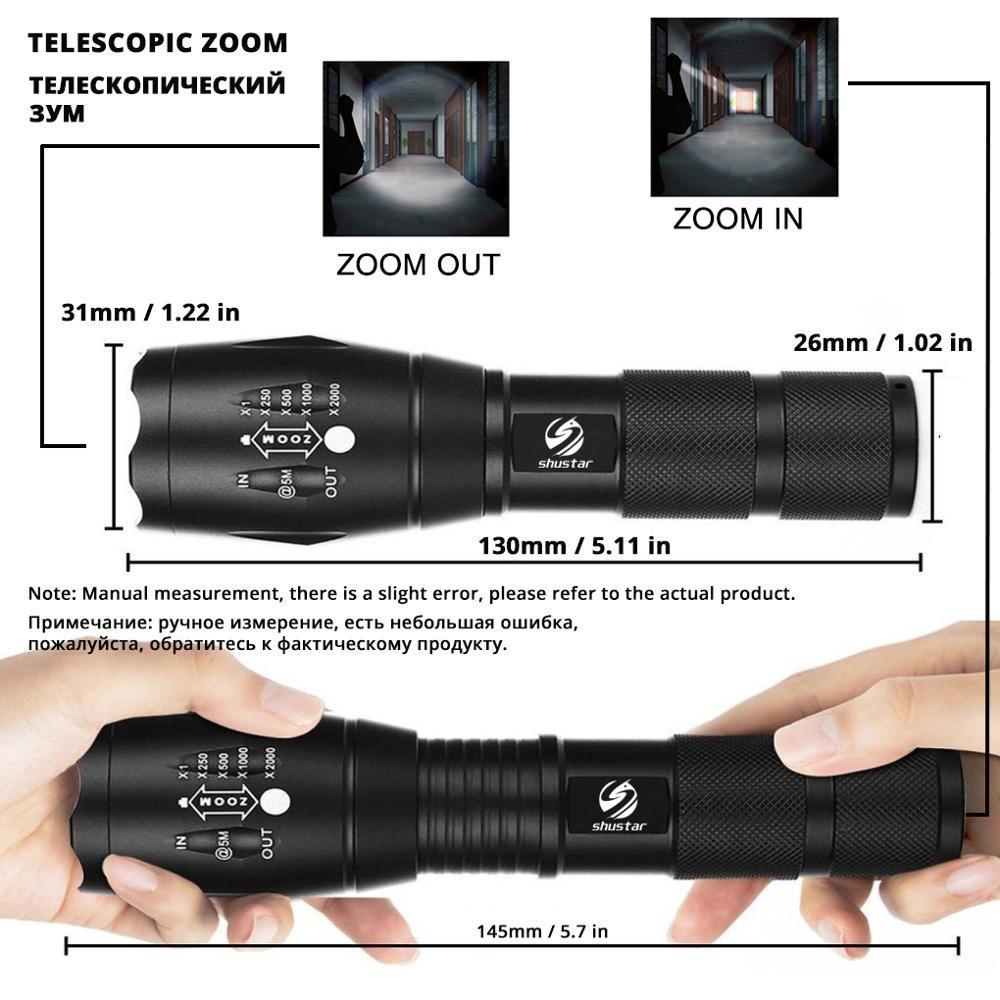 Our flashlight has 3 kinds of lamp bead selection, T6 has the lowest brightness, L2 is brighter than T6, and V6 is brighter than L2.