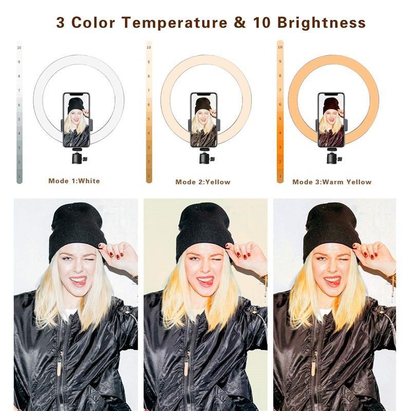 • ADJUSTABLE LIGHT COLOR: This feature is very important because in every video and photo needs a different light placement and adjustment. There is 3 lighting mode in the ring light (white, warm yellow and warm white).