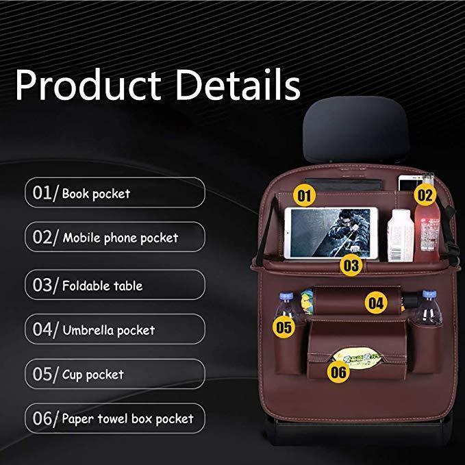 - Multi-functional seat organizer. A must-have car accessories for traveling, a great place to store your phone, these heavy-duty seat organizers also have a tablet holder, cup holder, umbrella holder, tissue holder and thickened folding table tray, comfortable place to eat during long and exhausting trips. Multi-functional and Omni bearing service needed for your kids during traveling.