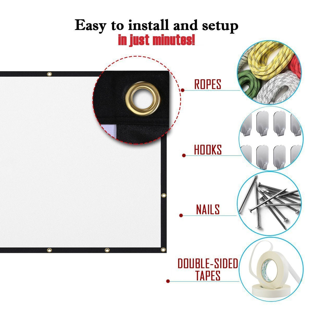 • EASY TO INSTALL. The projection screen can be easily secured with hooks, ropes, brackets, nails, double-sided tape on the wall/bracket.