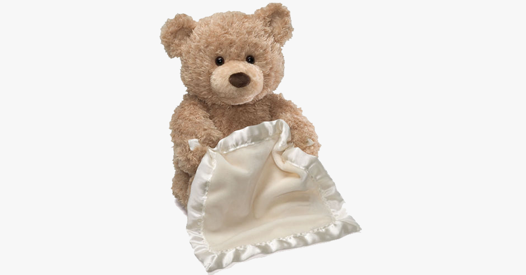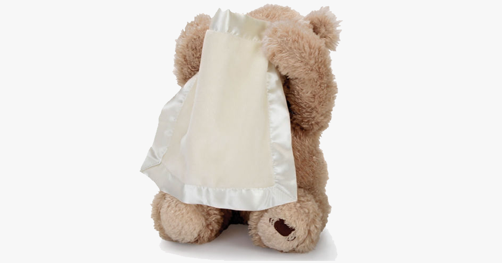 The Peek-A-Boo Bear features movable mouth and arms, as well as a blanket that is accented with satin for a great touch and feel sensation for baby. At the push of a button on the bears foot, the bear recites one of six different phrases and hides behind a blanket before popping back out to delight baby with an interactive game of peek-a-boo!