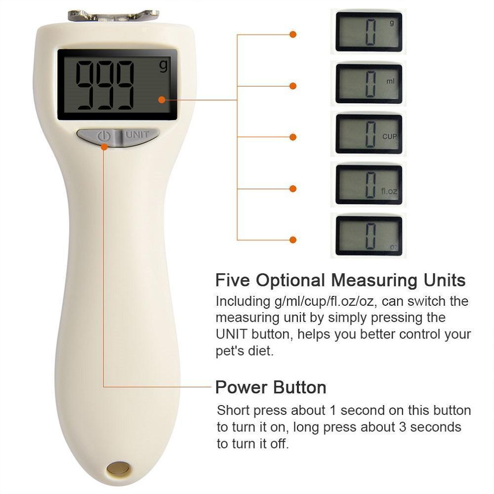 The Pet food digital scale measuring cup, is the best way to ensure your fur baby is getting the exact amount of food needed on a daily basis to ensure the best health possible. It has five measuring units, including g, ml, cup, fl.oz and oz, which offers you extra convenience to measure pets food portions and helps you better control your pet's diet. Designed with detachable spoon, this pet food measuring spoon is not only simple to install and remove, but also easy to clean after use.