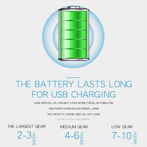 - USB Rechargeable: The lithium battery built-in fan was powered by USB. When fully charged it can work up to 6-10 hours.
